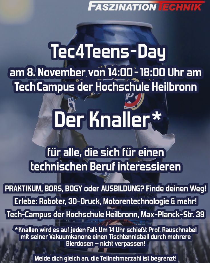 Am 8. November waren Jugendliche zwischen 13 und 18 Jahren eingeladen, sich über mögliche technische Ausbildungen und Berufe zu informieren. 10 innovative Firmen präsentierten sich mit ihren Produkten, Labor-Führungen zeigten interessante Einblicke in die Hochschule und "Physik muss knallen" ergänzte mit coolen Experimenten das Thema "Technik".